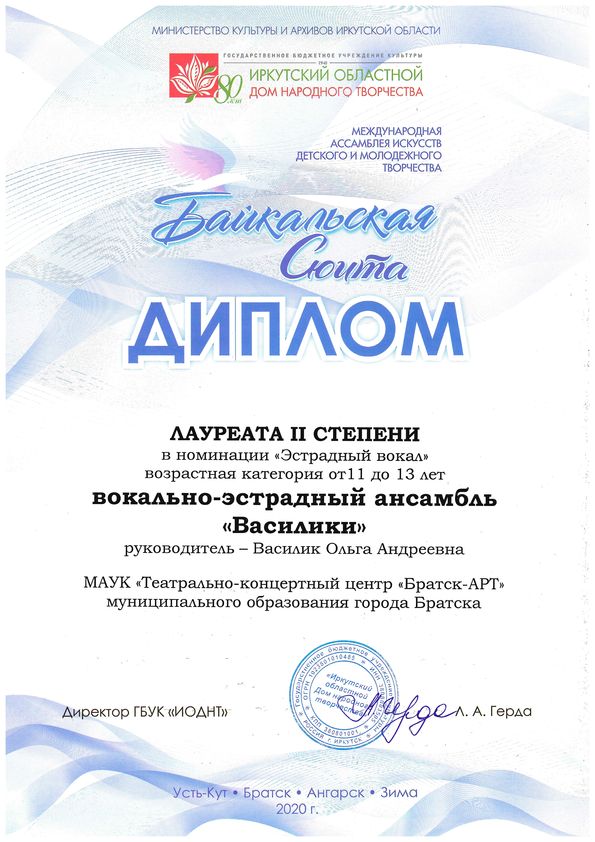 - диплом участника в номинации «Эстрадный вокал (от 7 до 10 лет)» областного конкурса вокальных ансамблей и хоровых коллективов «Байкальская рапсодия» в рамках Международной ассамблеи искусств детского и молодежного творчества «Байкальская сюита» (г. Братск)