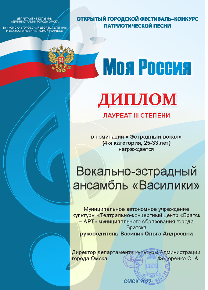 - диплом Лауреата III степени открытого городского фестиваля-конкурса патриотической песни «Моя Россия» в номинации «Эстрадный вокал», возрастная группа 25-33 лет, г. Омск