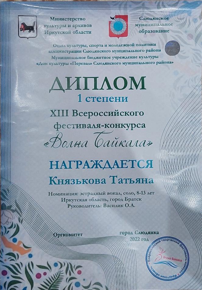 - диплом I степени XIII Всероссийского фестиваля-конкурса «Весна Байкала» в номинации «Эстрадный вокал. Соло», возрастная группа 8-13 лет, г. Слюдянка