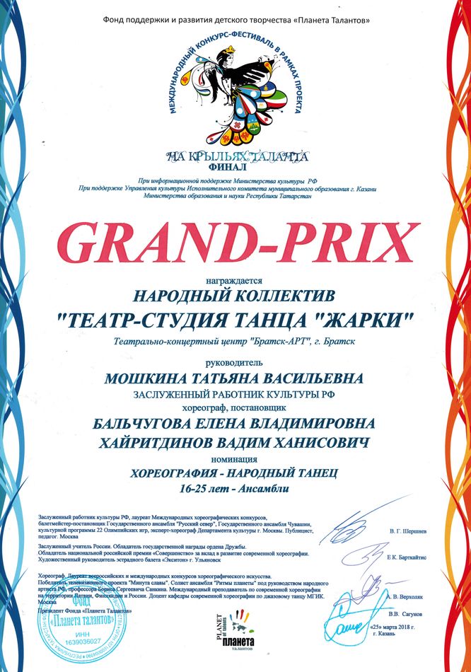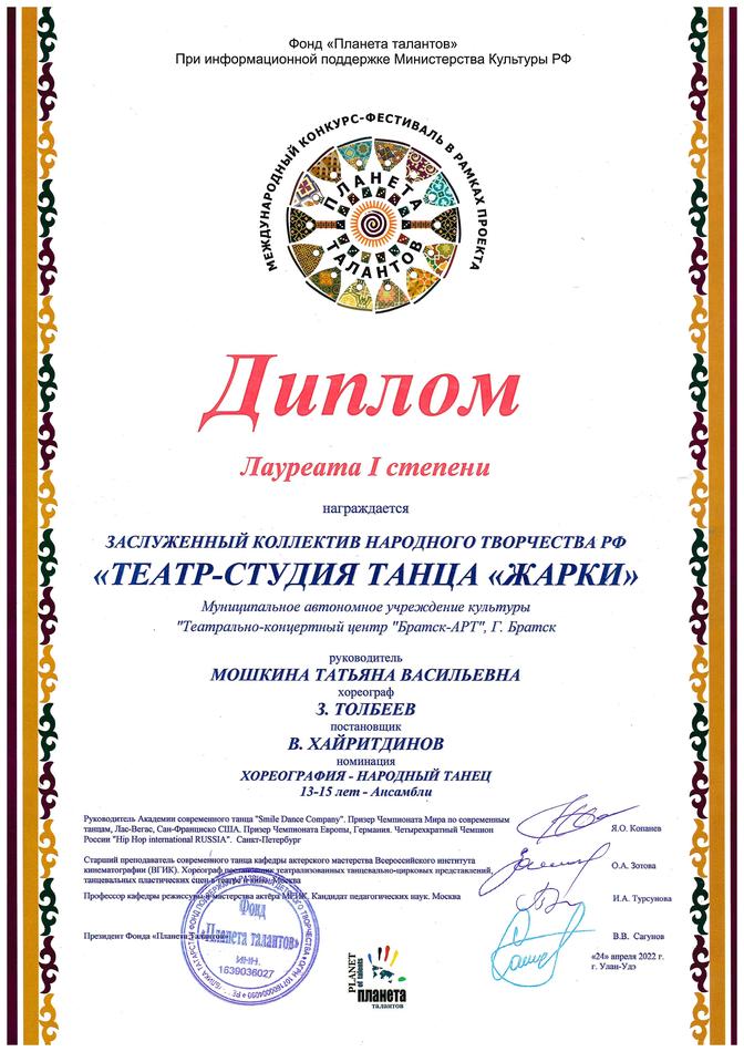 - диплом Гран-При Международного конкурса-фестиваля «Планета талантов» в номинации «Народный танец», возрастная категория смешанная, г. Улан-Удэ