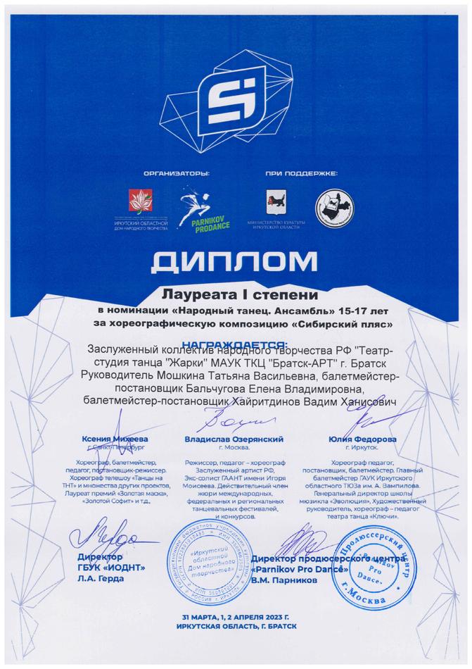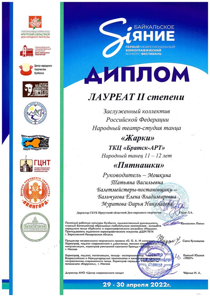 - диплом Лауреата I степени II Межрегионального хореографического конкурса-фестиваля «Байкальское Siяние» в номинации «Народный танец. Ансамбль» за хореографическую композицию «Сибирский пляс», возрастная группа 15-17 лет, г. Братск