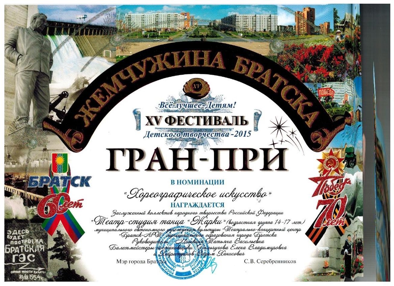 - диплом Гран-при в номинации «Хореографическое искусство» (10-14 лет), диплом Лауреата I степени в номинации «Хореографическое искусство» (10-13 лет), диплом Лауреата III степени в номинации «Хореографическое искусство» (7-9 лет) XV городского фестиваля детского творчества «Жемчужина Братска» (г. Братск)