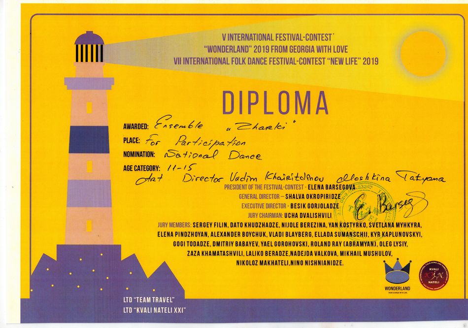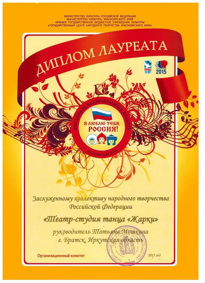 - диплом Лауреата I степени Всероссийского этнокультурного фестиваля «Мы разные. Мы вместе!» в номинации «Народный танец», г. Иркутск