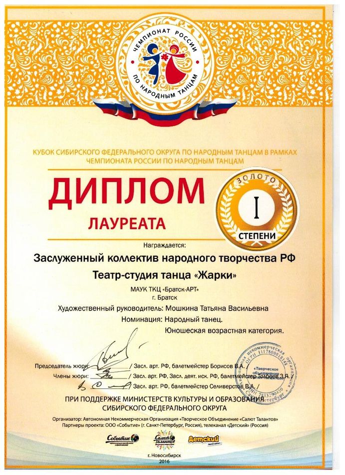 - диплом Лауреата I степени Байкальского международного ART-фестиваля-конкурса «Vivat, талант» в номинации «Народный танец», возрастная группа 15-18 лет, номер «Сибирский пляс», г. Иркутск