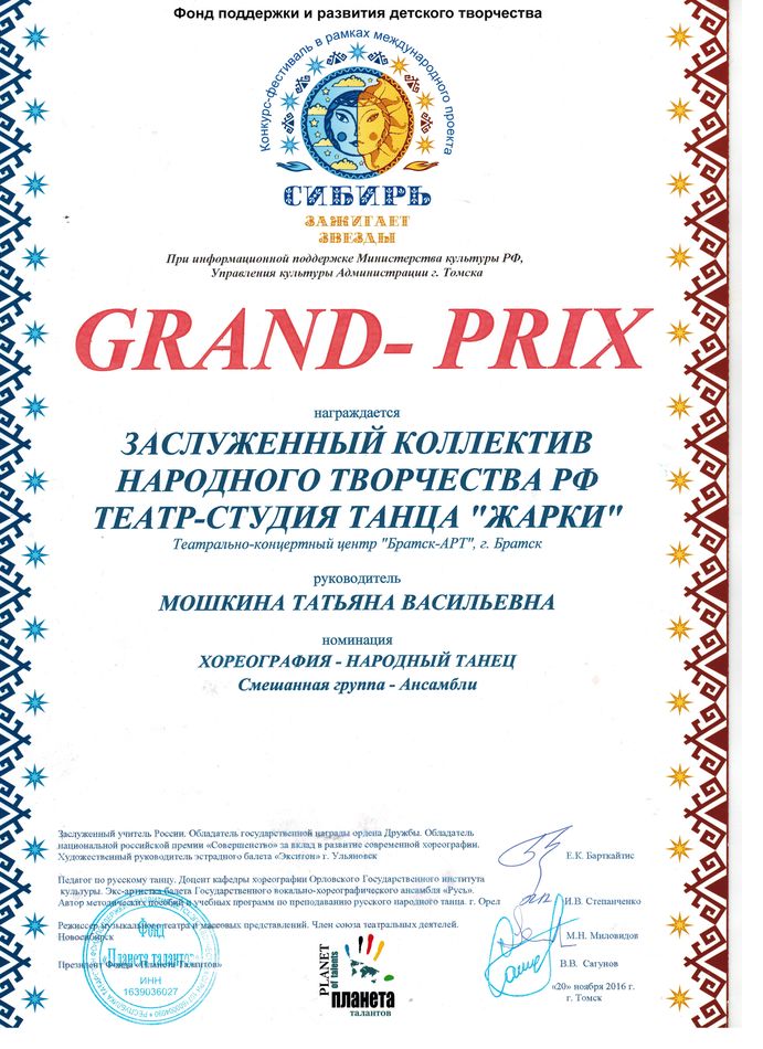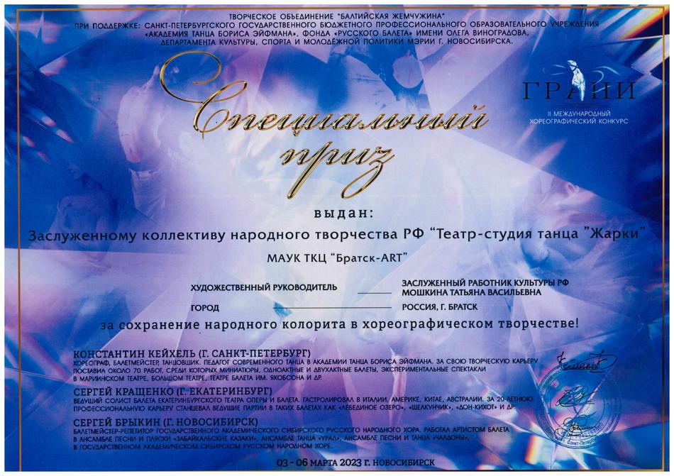 - специальный приз «За сохранение народного колорита в хореографическом творчестве Международного хореографического конкурса «Грани», г. Новосибирск