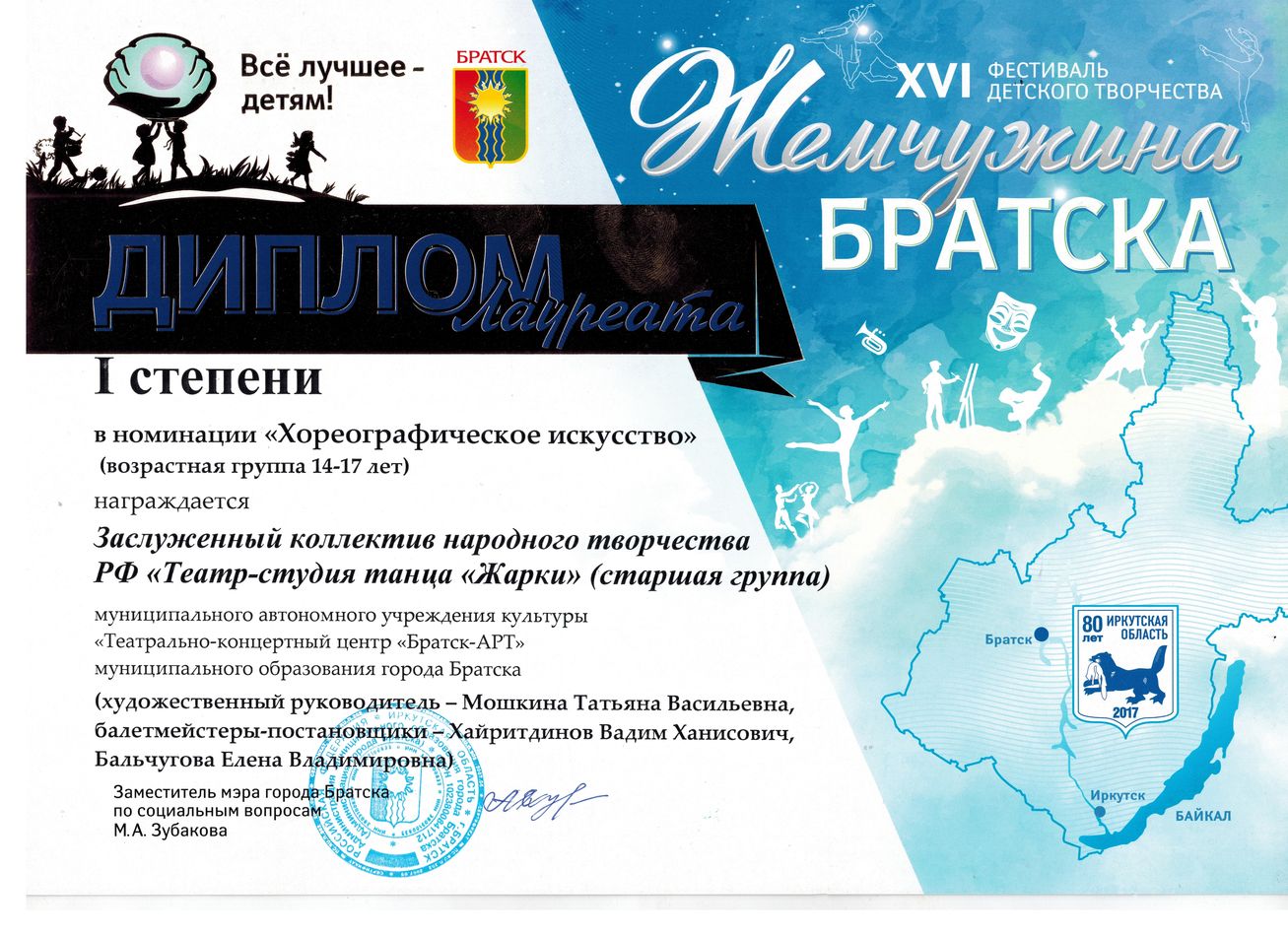 - диплом Лауреата I степени в номинации «Хореографическое искусство» (7-9 лет), диплом Лауреата II степени в номинации «Хореографическое искусство» (10-13 лет), диплом Лауреата I степени в номинации «Хореографическое искусство» (14-17 лет) XVI городского фестиваля детского творчества «Жемчужина Братска (г. Братск)