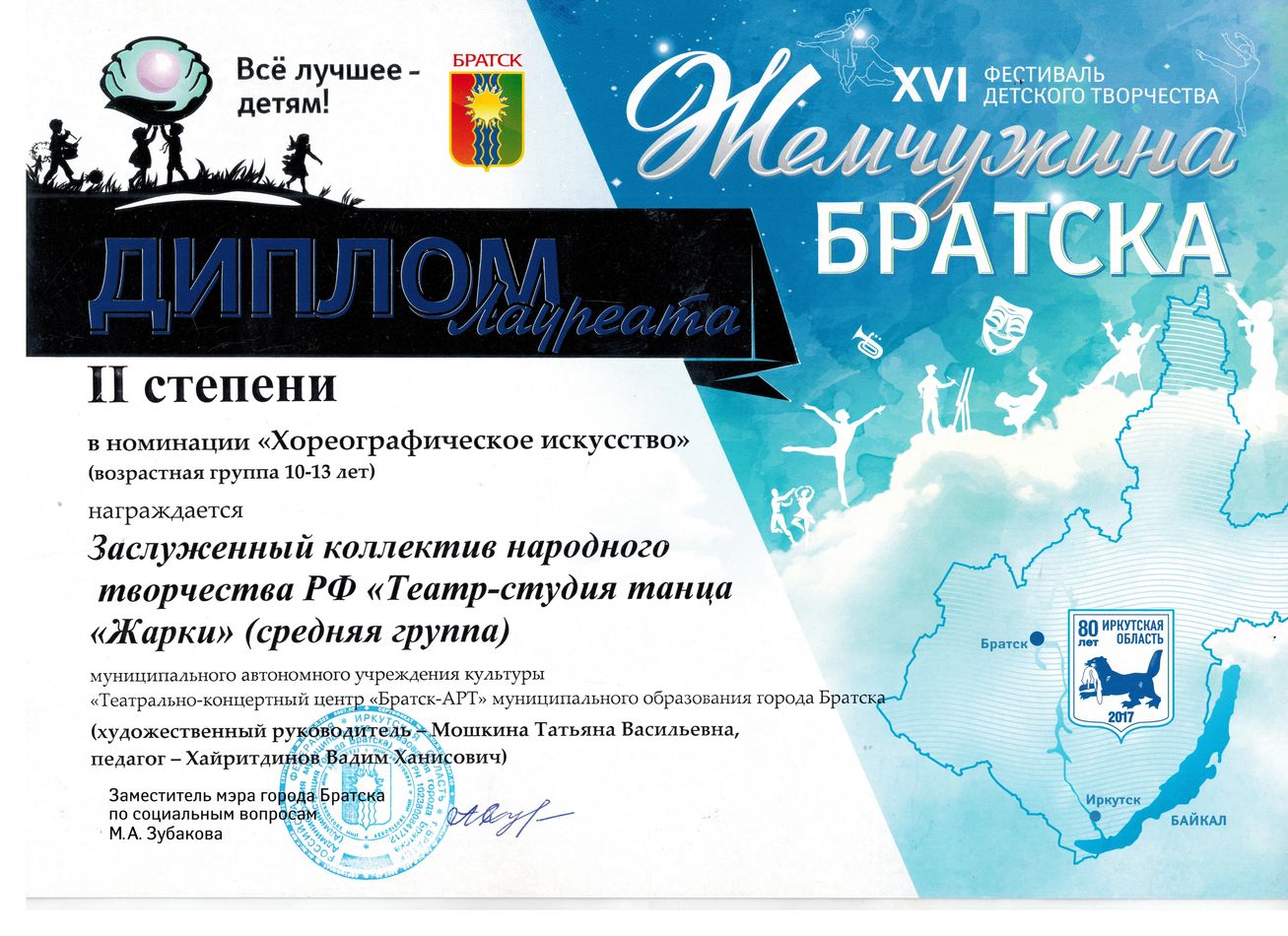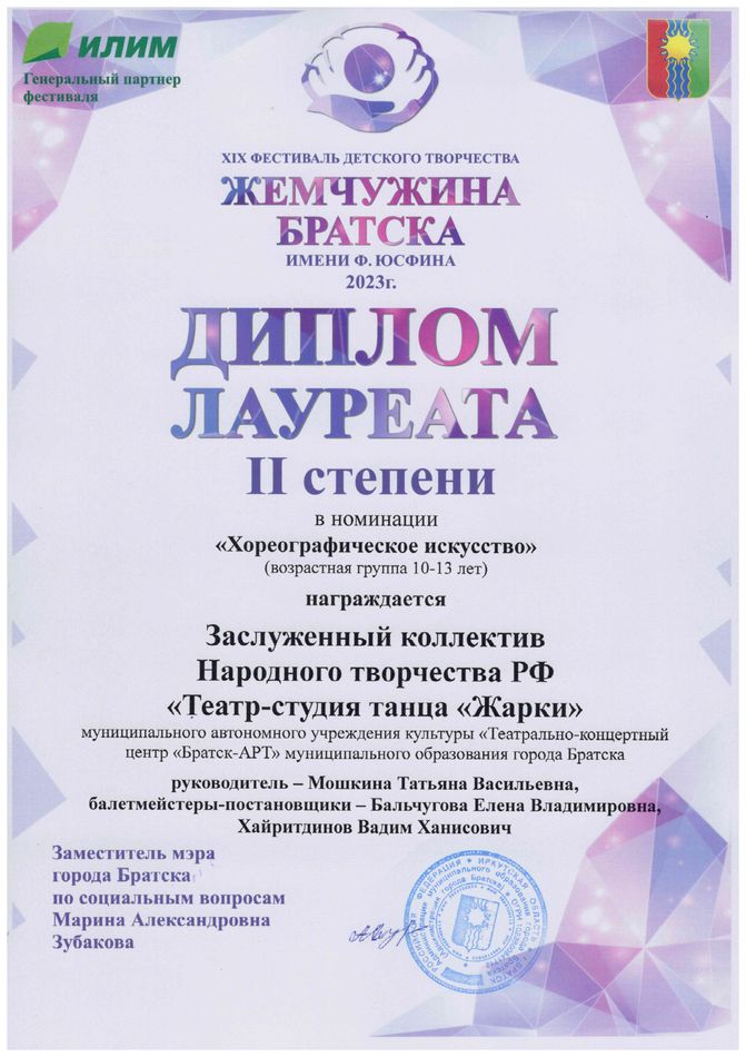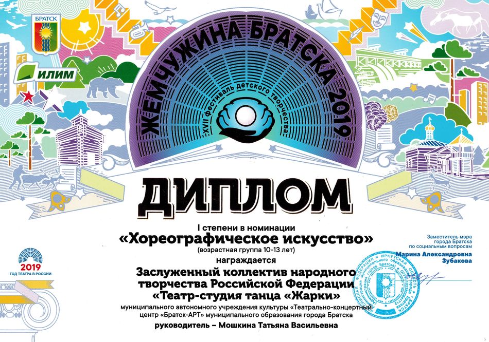 - диплом Лауреата II степени XIX Фестиваля детского творчества «Жемчужина Братска им. Ф. Юсфина» в номинации «Хореографическое искусство» (возрастная группа 10-13 лет), г. Братск
