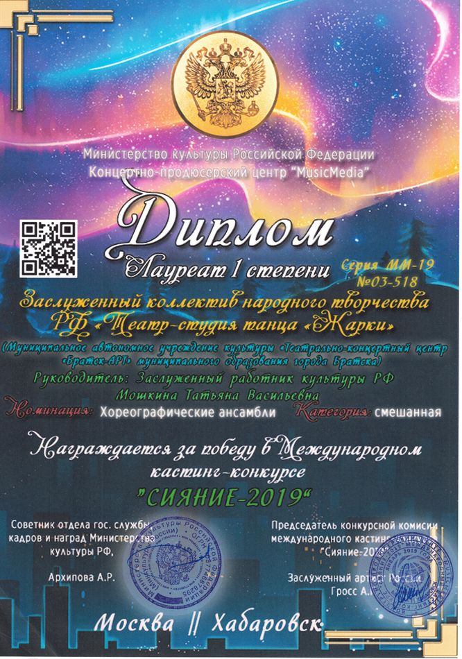 - диплом Лауреата I степени в номинации «Хореографические ансамбли» (возрастная группа смешанная) Международного кастинг-конкурса «Сияние - 2019» (г. Москва - г. Хабаровск)