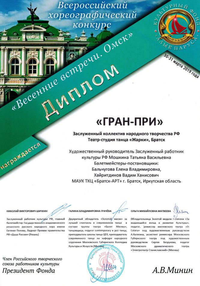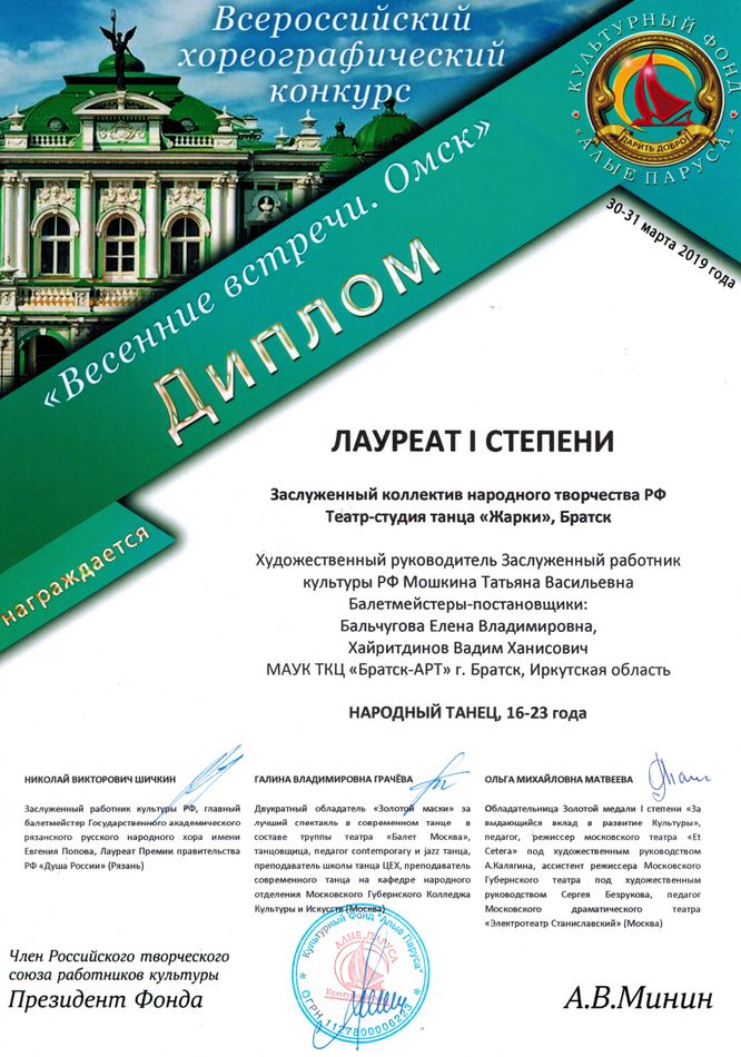 - диплом Гран-при конкурса, диплом Лауреата I степени в номинации «Народный танец» (возрастная группа 16-23 года) Всероссийского хореографического конкурса «Весенние встречи. Омск» (г. Омск)
