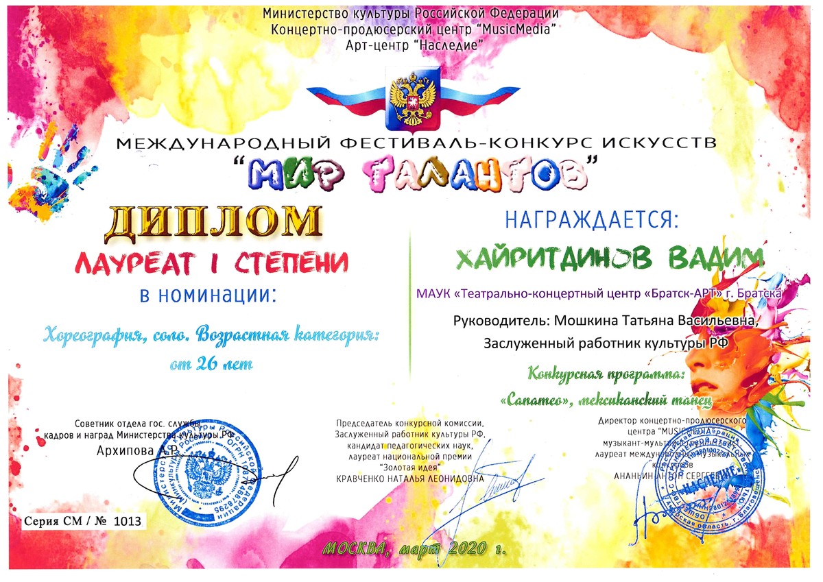 - диплом Лауреата I степени Международного фестиваля-конкурса искусств «Мир талантов» в номинации «Хореография, соло», возрастная категория от 26 лет, г. Москва - г. Хабаровск