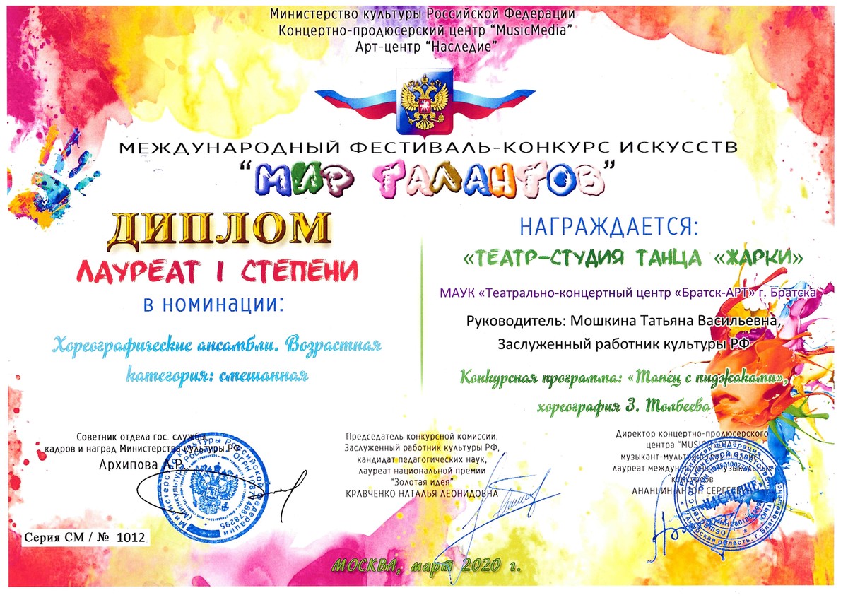 - диплом Лауреата I степени Международного фестиваля-конкурса искусств «Мир талантов» в номинации «Хореографические ансамбли», возрастная категория, смешанная, г. Москва - г. Хабаровск