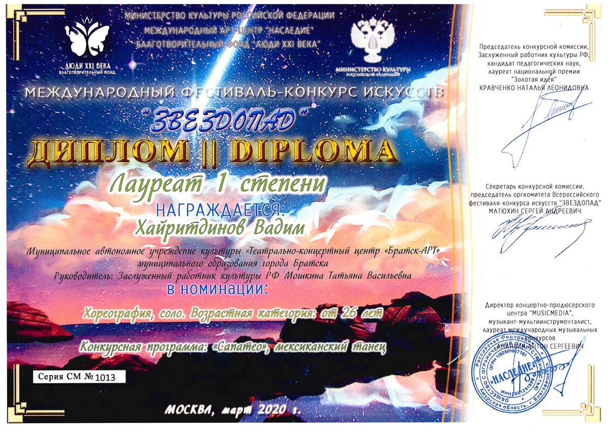 - диплом Лауреата I степени Международного конкурса творчества «Звездопад» в номинации «Хореография, соло», возрастная категория от 26 лет, г. Москва - г. Хабаровск