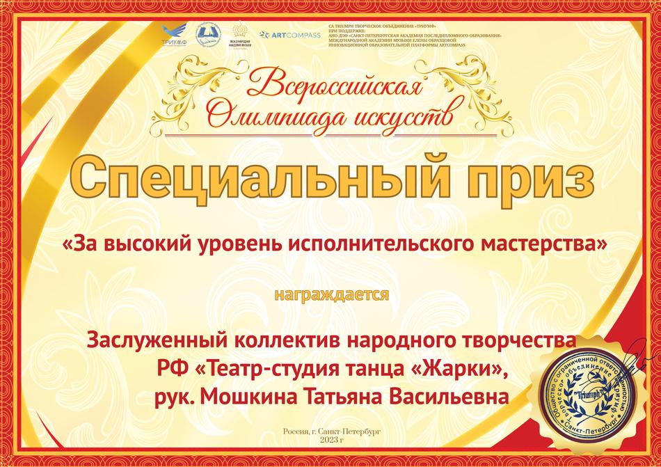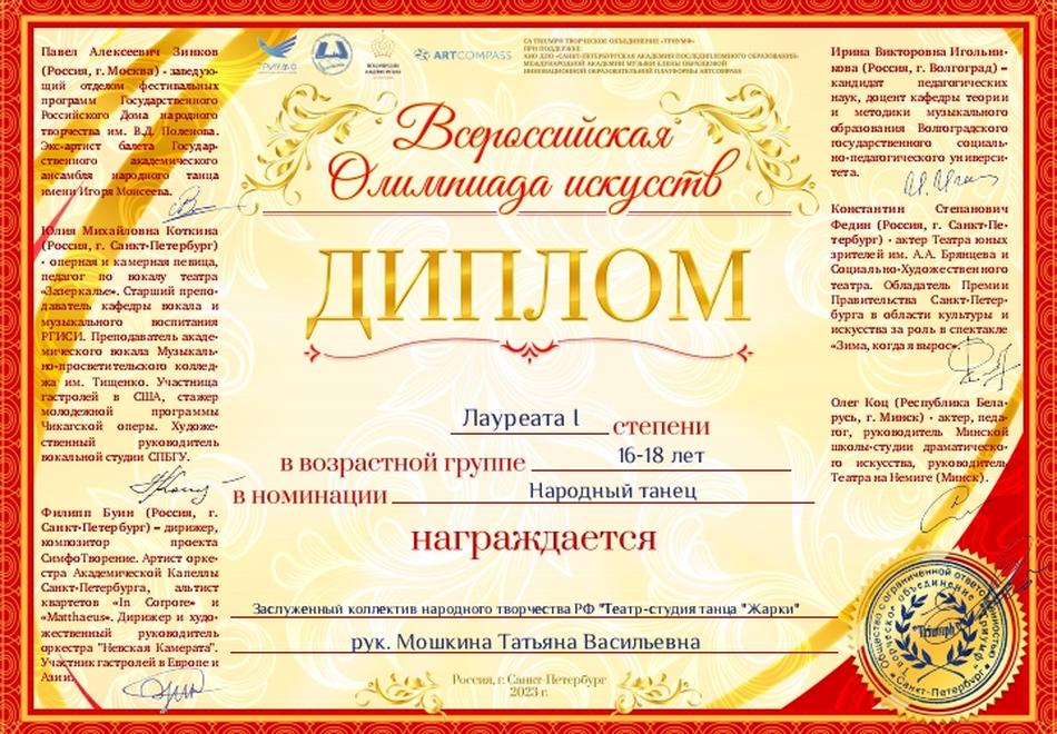 - диплом Лауреата I степени Всероссийской Олимпиады искусств в номинации «Народный танец», возрастная группа 16-18 лет, г. Санкт-Петербург