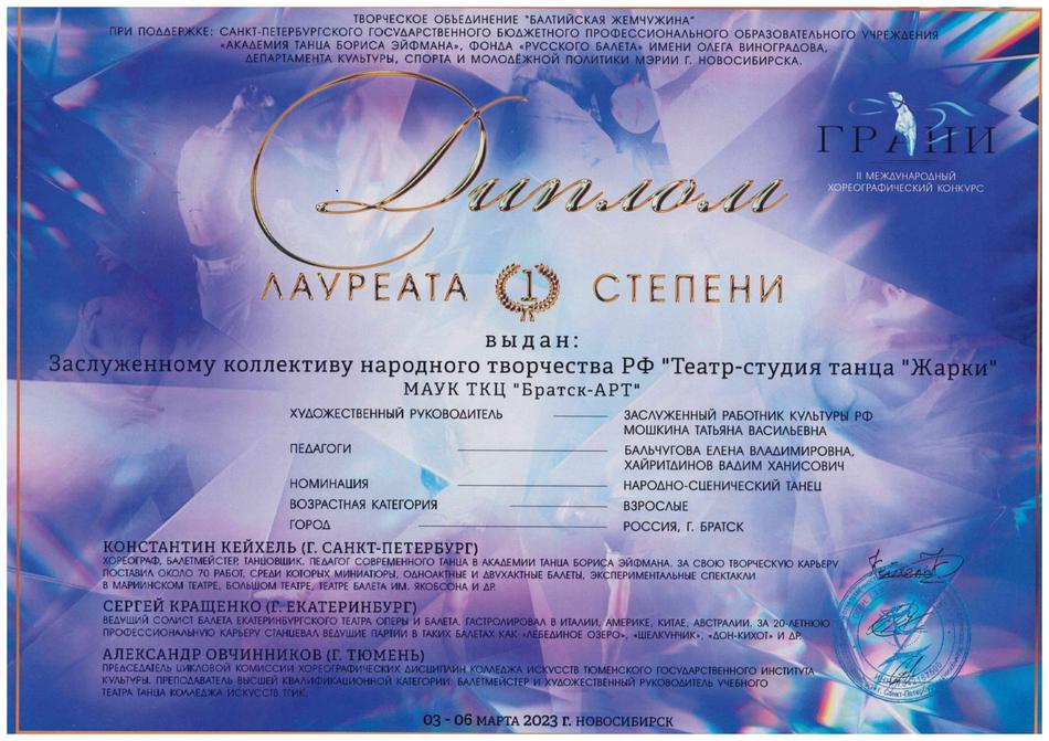 - диплом Лауреата I степени Международного хореографического конкурса «Грани» в номинации «Народно-сценический танец», возрастная группа взрослые, г. Новосибирск