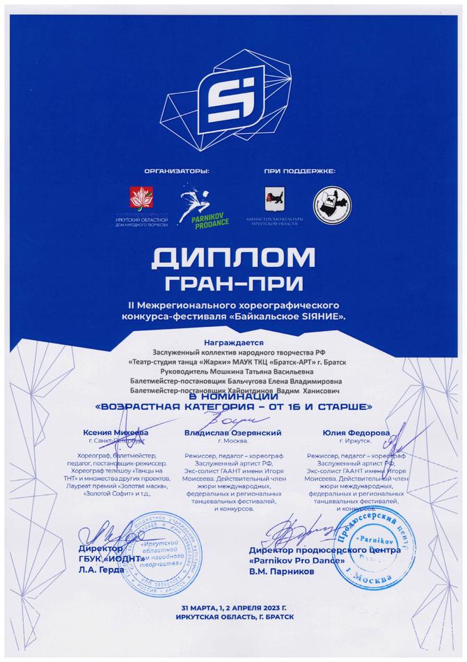 - диплом Гран-При II Межрегионального хореографического конкурса-фестиваля «Байкальское Siяние», г. Братск