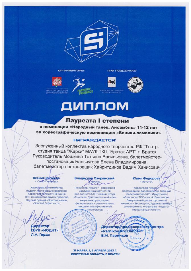 - диплом Лауреата I степени II Межрегионального хореографического конкурса-фестиваля «Байкальское Siяние» в номинации «Народный танец. Ансамбль» за хореографическую композицию «Веники-помелики», возрастная группа 11-12 лет, г. Братск