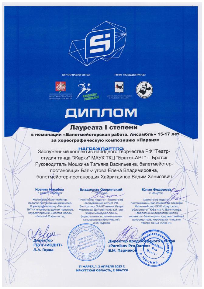 - диплом Лауреата I степени II Межрегионального хореографического конкурса-фестиваля «Байкальское Siяние» в номинации «Балетмейстерская работа. Ансамбль» за хореографическую композицию «Параня», возрастная группа 15-17 лет, г. Братск