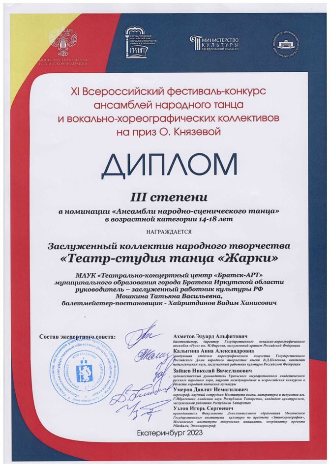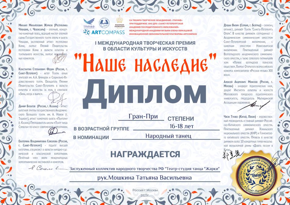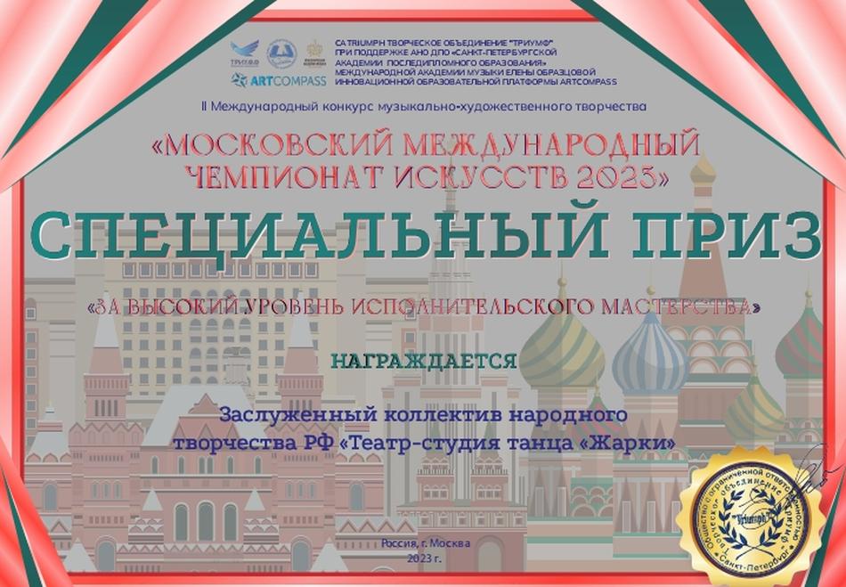 - диплом Лауреата I степени II Международного конкурса музыкально-художественного творчества «Московский Международный чемпионат искусств-2023» в номинации «Народный танец», возрастная группа 16-18 лет
