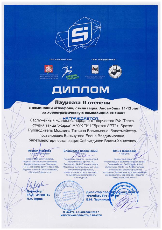 - диплом Лауреата II степени II Межрегионального хореографического конкурса-фестиваля «Байкальское Siяние» в номинации «Неофолк, стилизация. Ансамбль» за хореографическую композицию «Лянок», возрастная группа 11-12 лет, г. Братск