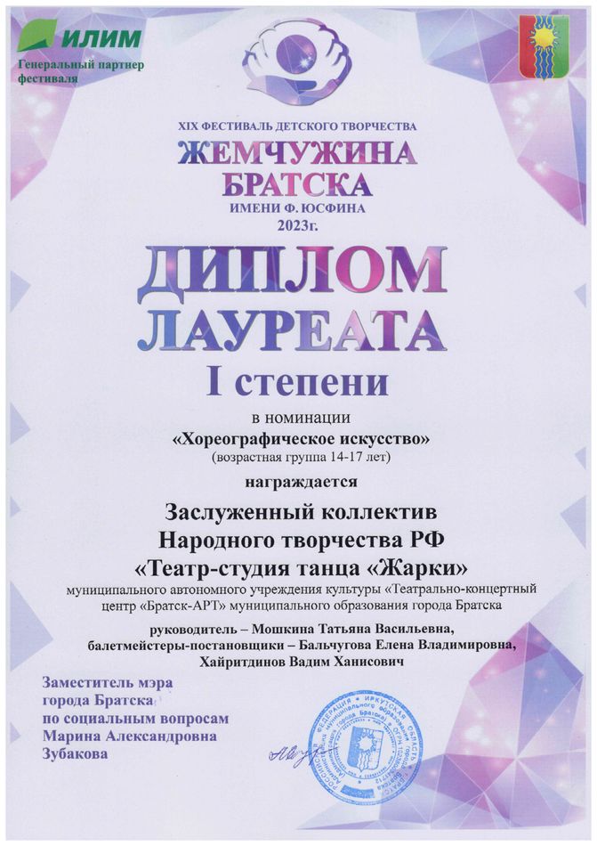 - диплом Лауреата I степени XIX Фестиваля детского творчества «Жемчужина Братска им. Ф. Юсфина» в номинации «Хореографическое искусство» (возрастная группа 14-17 лет), г. Братск