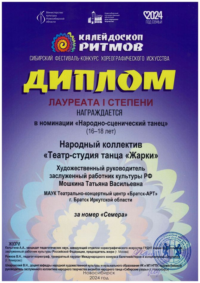 - диплом Лауреата I степени Сибирского фестиваля-конкурса хореографического искусства «Калейдоскоп ритмов» в номинации «Народно-сценический танец», возрастная категория 16-18 лет, г. Новосибирск (за номер «Семёра»)