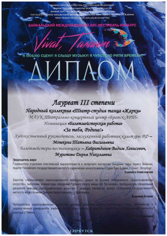 - диплом Лауреата III степени Байкальского международного ART-фестиваля-конкурса «Vivat, талант» в номинации «Балетмейстерских работ», номер «За тебя, Родина!», г. Иркутск