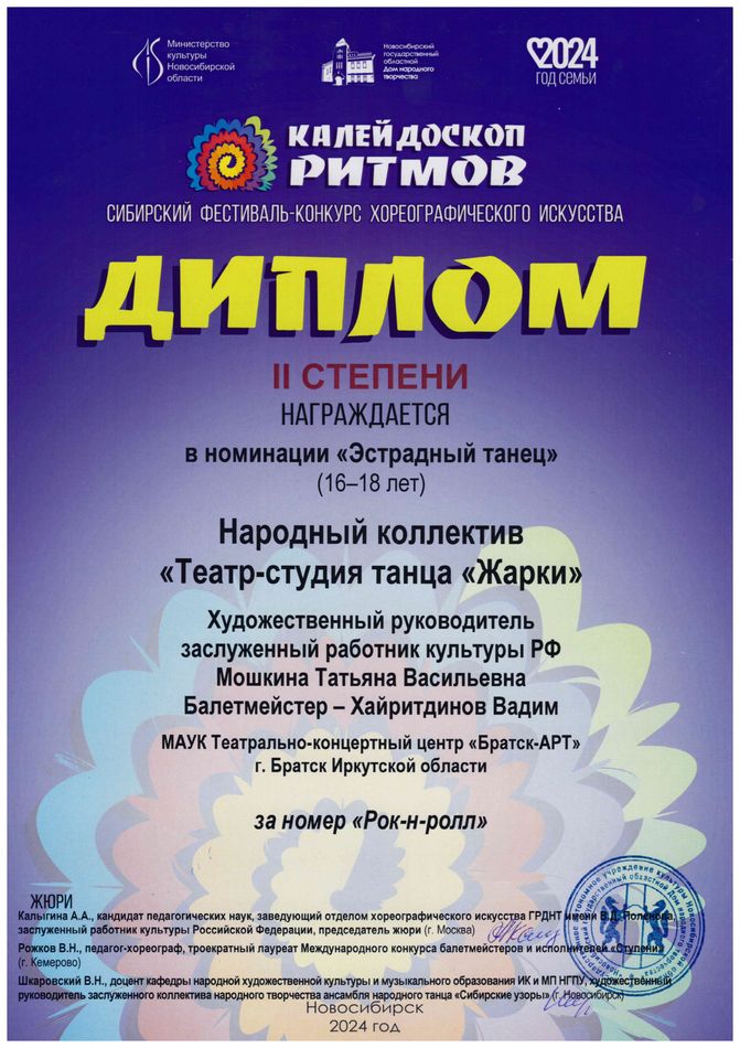 - диплом Гран-При Сибирского фестиваля-конкурса хореографического искусства «Калейдоскоп ритмов», г. Новосибирск