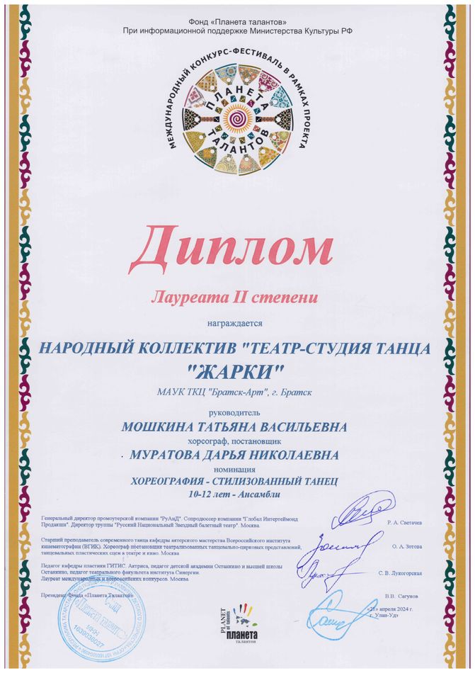 - диплом Лауреата II степени Международного конкурса-фестиваля в рамках проекта «Планета талантов» в номинации «Хореография – стилизованный танец», возрастная категория 10-12 лет, г. Улан-Удэ
