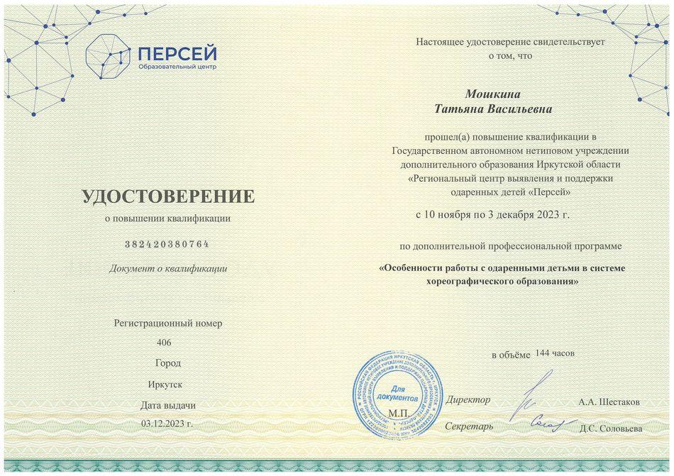 Курсы повышения квалификации «Особенности работы с одаренными детьми в системе хореографического образования», Образовательный центр «Персей», 144 ч., 2023 г.