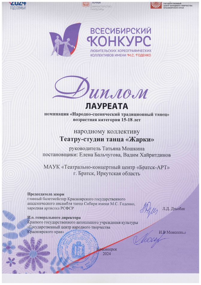 - диплом Лауреата Всесибирского конкурса любительских хореографических коллективов имени М.С. Годенко в номинации «Народно-сценический традиционный танец», возрастная категория 15-18 лет, г. Красноярск