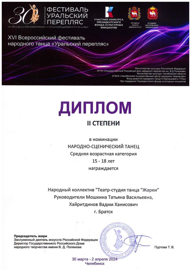 - диплом участника XIV Всероссийского фестиваля народного танца «Уральский перепляс» на приз династии хореографов Н. Карташовой и Т. Реус в номинации «Сценический народный танец», г. Челябинск