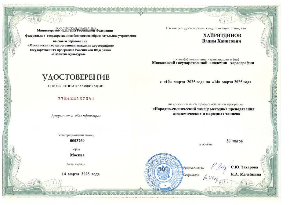 - удостоверение о повышении квалификации "Народно-сценический танец: методика преподавания академических и народных танцев", г. Москва, 2025 г.
