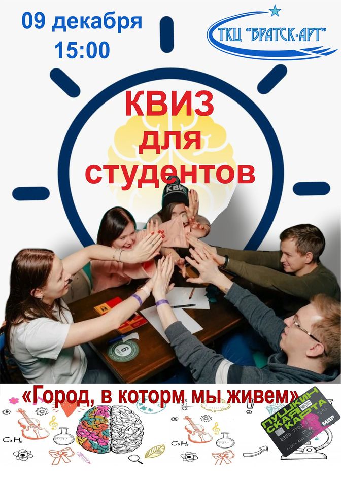 Участникам квиз-клуба в ТКЦ «Братск-АРТ» будет предложен увлекательный способ получения новых знаний и положительных эмоций, развития логики, мышления, памяти, формирования социальных навыков.