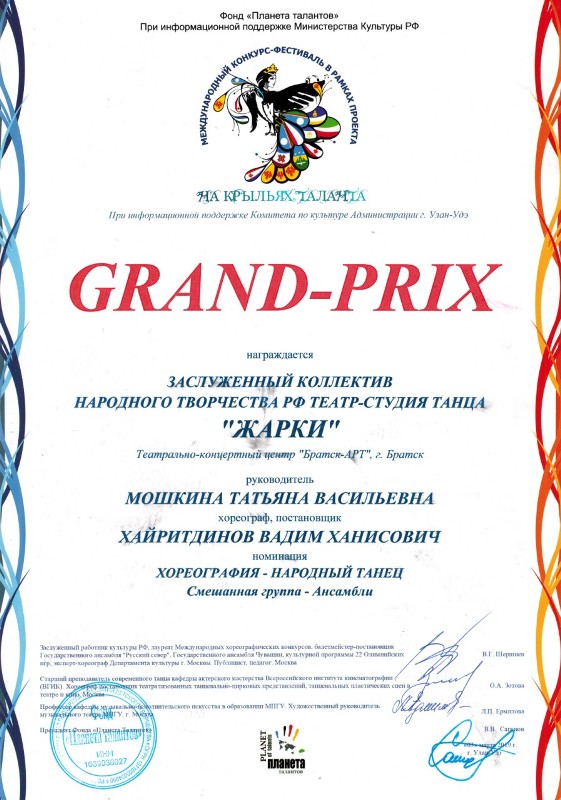 Поздравляем победителей! 07 марта 2019 Просмотров: 1217 Поздравляем Заслуженный коллектив народного творчества РФ театр- студию танца «Жарки» с победой в международном конкурсе — фестивале в рамках проекта «На крыльях таланта» который проходил 3 марта 2019 года в городе Улан-Удэ. Теги: жарки, конкурс Назад Вперёд
